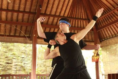 I go into downward dog....it's been a while. Then pigeon for 2 min each side so I can get my kicks up higher by stretching my waist/hips. Training for that high side kick. Then I think the impossible....a dream but I am awake, seeing Dave in Bali perfectly executing a perpendicular arm balance. And me needing help just to get up there. now, 35 lbs smaller...could I do it too? YES I CAN. I focus.....concentrate on the breath....lock my head and shoulders securely and step into crow....."Remember what you were taught" says Dave's voice in my head, and as if by themselves, my legs begin walking up toward my head. 1 up. the next up, then down. MORE BALANCE! "concentrate"....then boom, I am in a perfect headstand. Absolutely straight up as I saw in the mirror, I switch to arm balancing with no problem. Then I think to go even further. Can I possibly do a scorpion? no way.... I'm too slow, too old, blah blah....but I remember Dave getting it, and I think to myself....its a good thing I have kept up with my full wheels and back arches......I then proceeded to use the force parallel to the ground, just like Dave taught me.....to lift my legs over my head and arch my back....and held scorpion pose for 5 seconds before crashing down......I DID IT! I did something I am proud of. I did something that yogis do....really good ones. and I held it....all because of your teaching and faith in me 35 pounds ago....